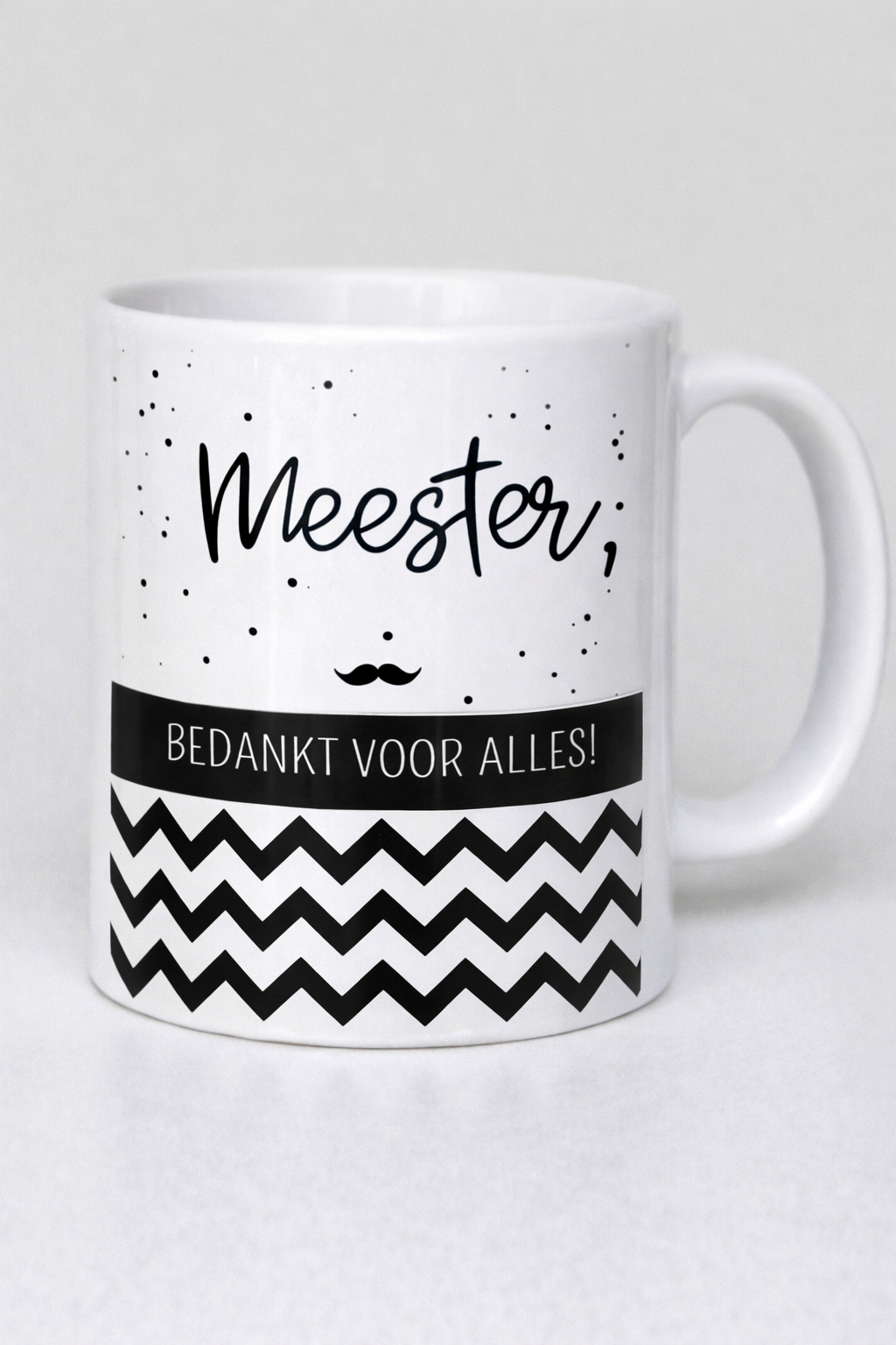 Verras de meester met een persoonlijk "Meester bedankt" cadeau! Een unieke mok die perfect is als bedankje aan het einde van het schooljaar.